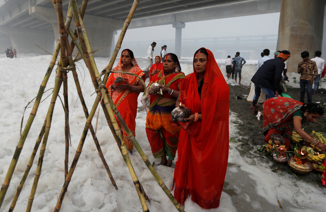 Una capa de espuma tóxica cubría las orillas y buena parte del sagrado río Yamuna, cerca la capital india, Nueva Delhi, cuando multitudes de hindúes se reunieron allí este miércoles para celebrar la fiesta religiosa de Chhath Puja.